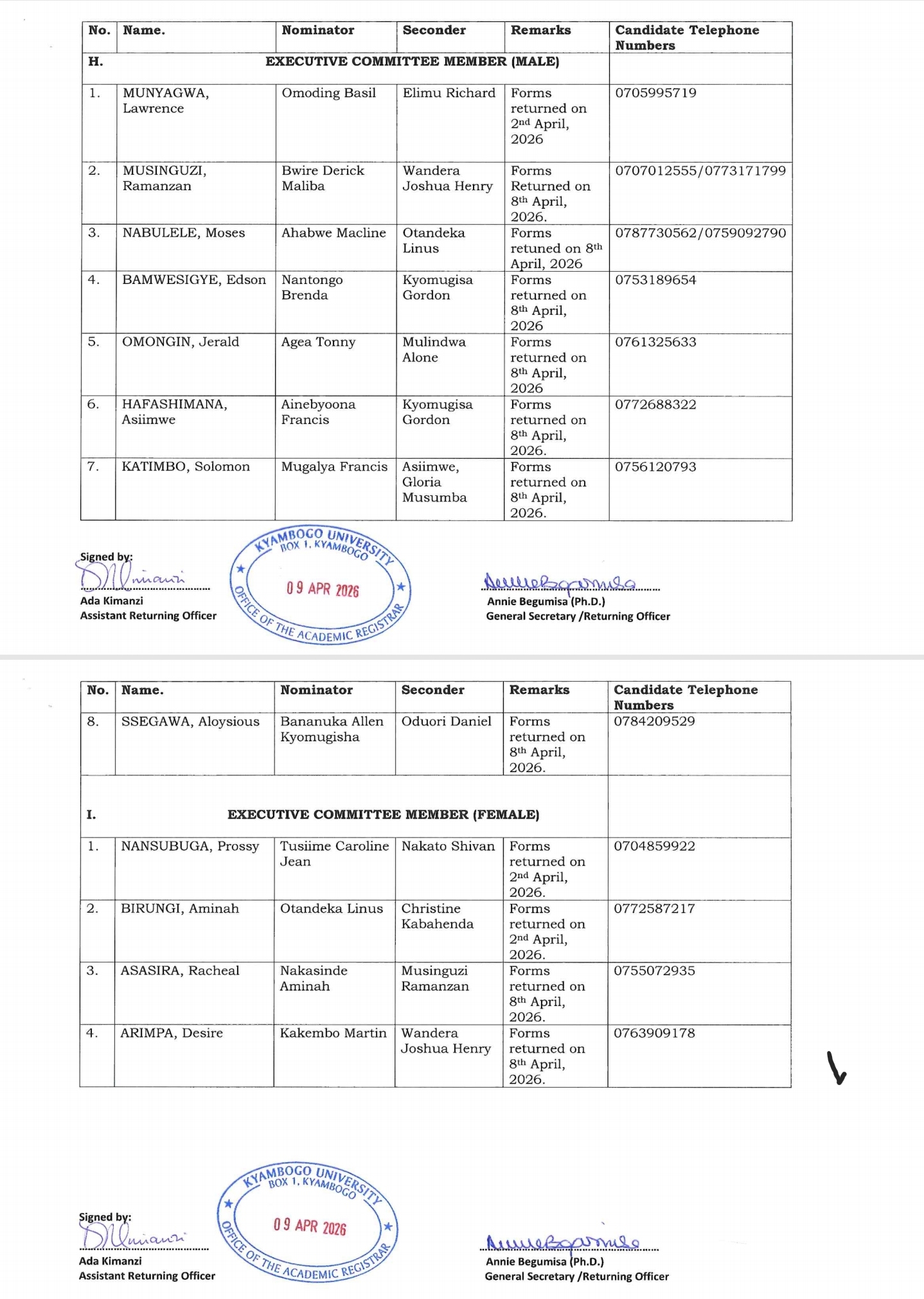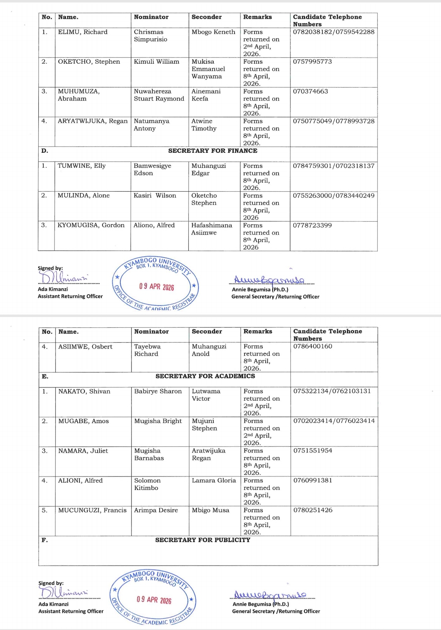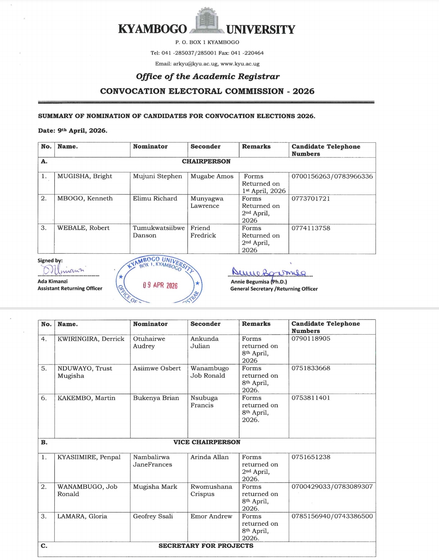 The Kyambogo University Electoral Commission has officially released the final nomination list for the upcoming elections, confirming all candidates who successfully completed the nomination process.
